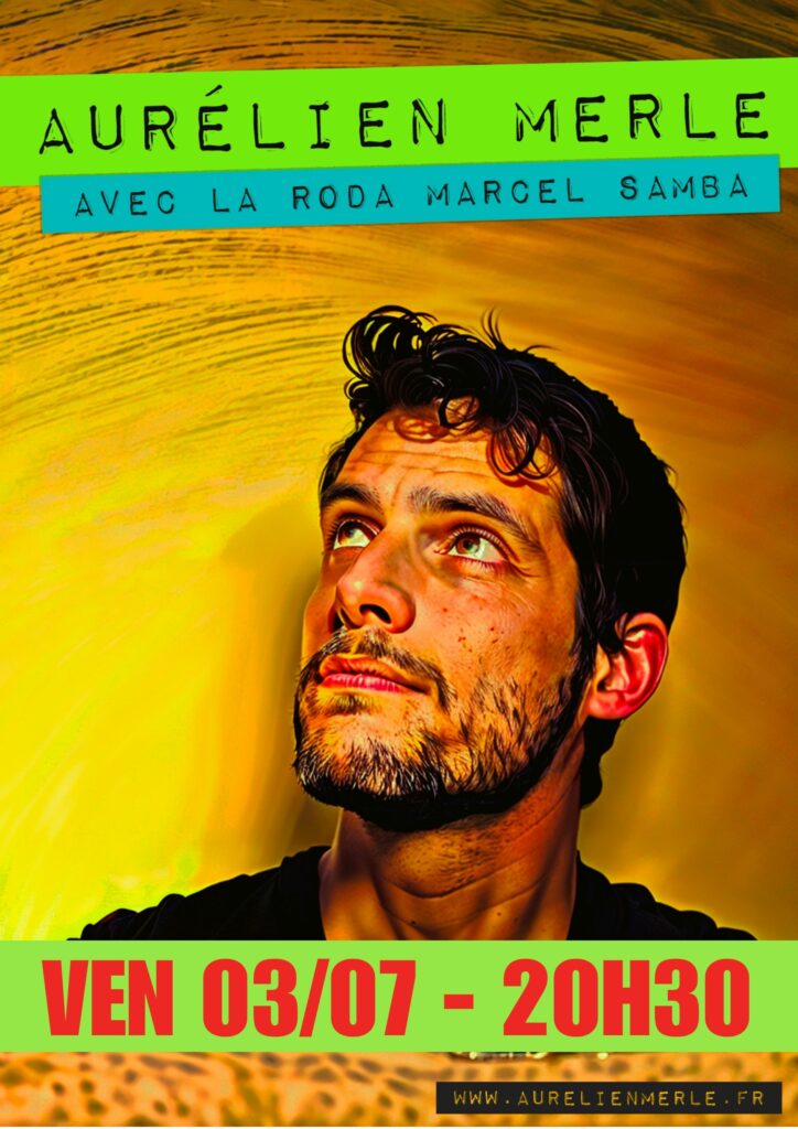 Chanteur éclectique, Aurélien Merle va où le plaisir le mène. Que ce soit en solo avec ses propres chansons, en trio à quatre avec Les Goguettes du même nom, ou avec la roda Marcel Samba, il se laisse guider tel le « bouchon de liège » au fil de l’eau, comme le figurait Pierre Barouh. Ce 3 juillet, accompagné des 7 musicien.nes de la roda Marcel Samba, Aurélien Merle vous invite à découvrir un répertoire de chansons brésiliennes allant de la saudade à la samba la plus festive !